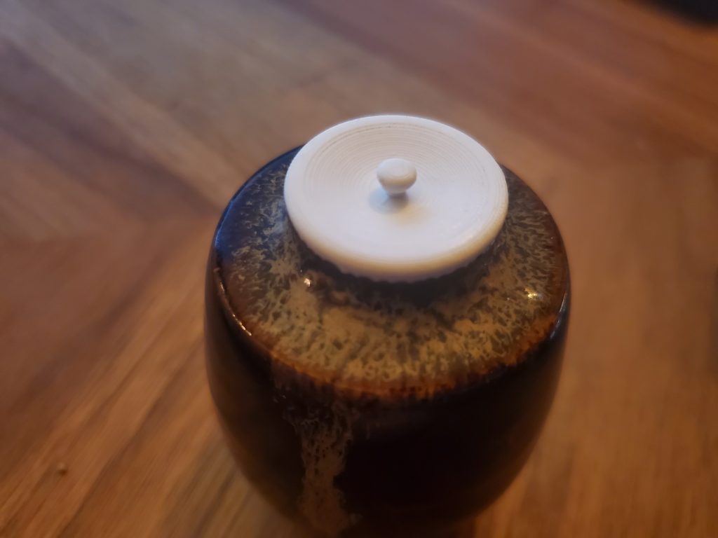 In studying Urasenke tea ceremony I wanted to learn how to do thick tea, or Koicha, ceremony. This requires a chaire, which is a fancy Japanese matcha tea holder. My teacher loaned me one but it didn’t have a lid, so I measured it and designed a lid for it.