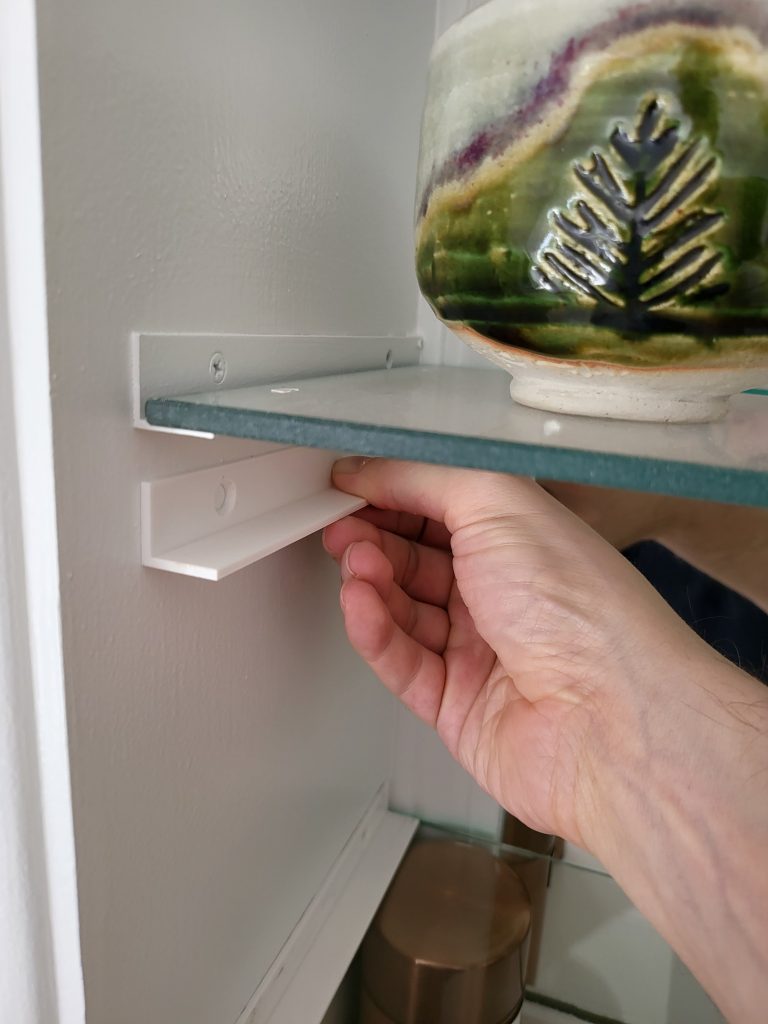 My tea room was formerly a bar, and it had a small shelf section with glass shelves held by white metal brackets. I measured the glass and had another piece cut to make a new shelf but for the life of me I couldn’t find any brackets that looked like the shelf brackets. Then I realized that I could just measure them and 3D print white plastic ones that would look exactly the same.