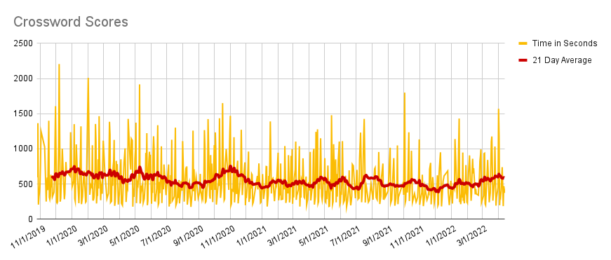 Either way, it was fun to realize I had a way to figure out if I had become dumber due to covid and to go down the rabbit hole to actually analyze the data. If my brain was damaged, I’m glad it’s not the crossword part. I’m already too far behind my cousin!